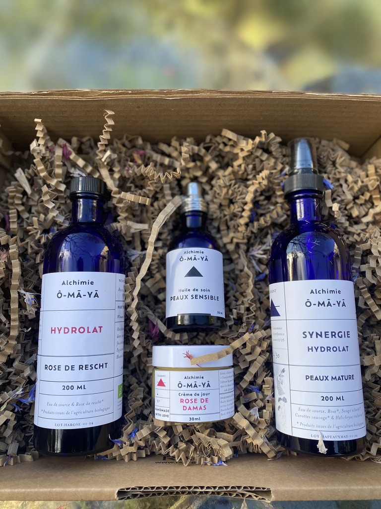 Coffrets routine, une ode à la rose et au coeur, apaiser la peau sèche meurtrie par le froid qui s’associe avec un hydrolat happy visage pour tous type de peaux + un hydrolat à la rose que vous pouvez utiliser en alternance sur votre visage. Une huile de soin peaux sensibles à base de macération solaire de rose et d’huile essentielle de rose de damas, pour hydrater les peaux les plus sensibles.